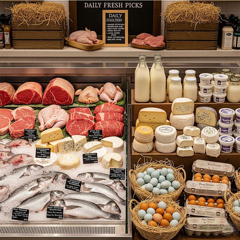 Dondurulmuş et, tavuk, balık ve deniz ürünleri.