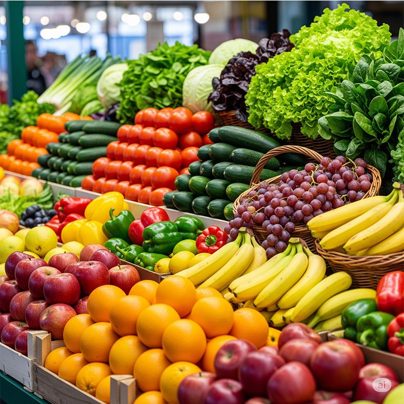 Domates, salatalık, biber, patlıcan, kabak, marul, ıspanak, pırasa gibi mevsime göre taze sebzeler.